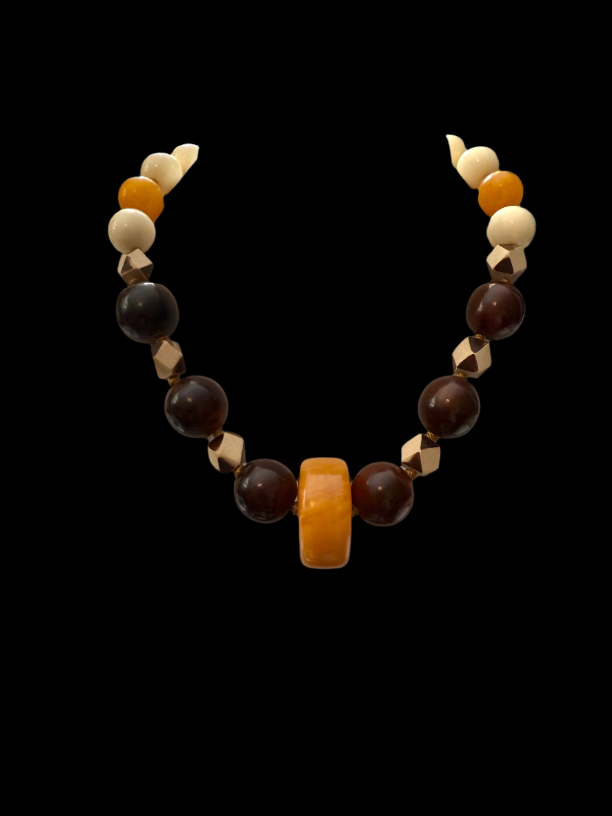 This 18" necklace showcases a stunning Ethiopian Amber 5mm disc centerpiece, meticulously paired with complementary beads crafted from horn, wood, reconstituted amber, and authentic vintage amber. Each element has been carefully selected to create a harmonious balance of natural textures and warm amber tones. The interplay of materials creates visual depth and interest, while the 18" length sits perfectly at the collarbone for maximum impact. This versatile piece adds a sophisticated accent to minimalist summer ensembles, particularly when contrasted against cream or neutral backgrounds. The natural variations in the amber and horn ensure each necklace has its own unique character, making it both a statement piece and a potential heirloom addition to your jewelry collection.