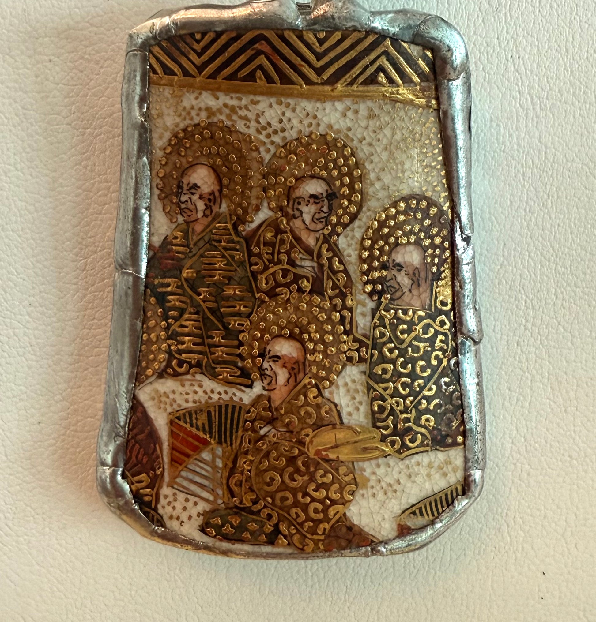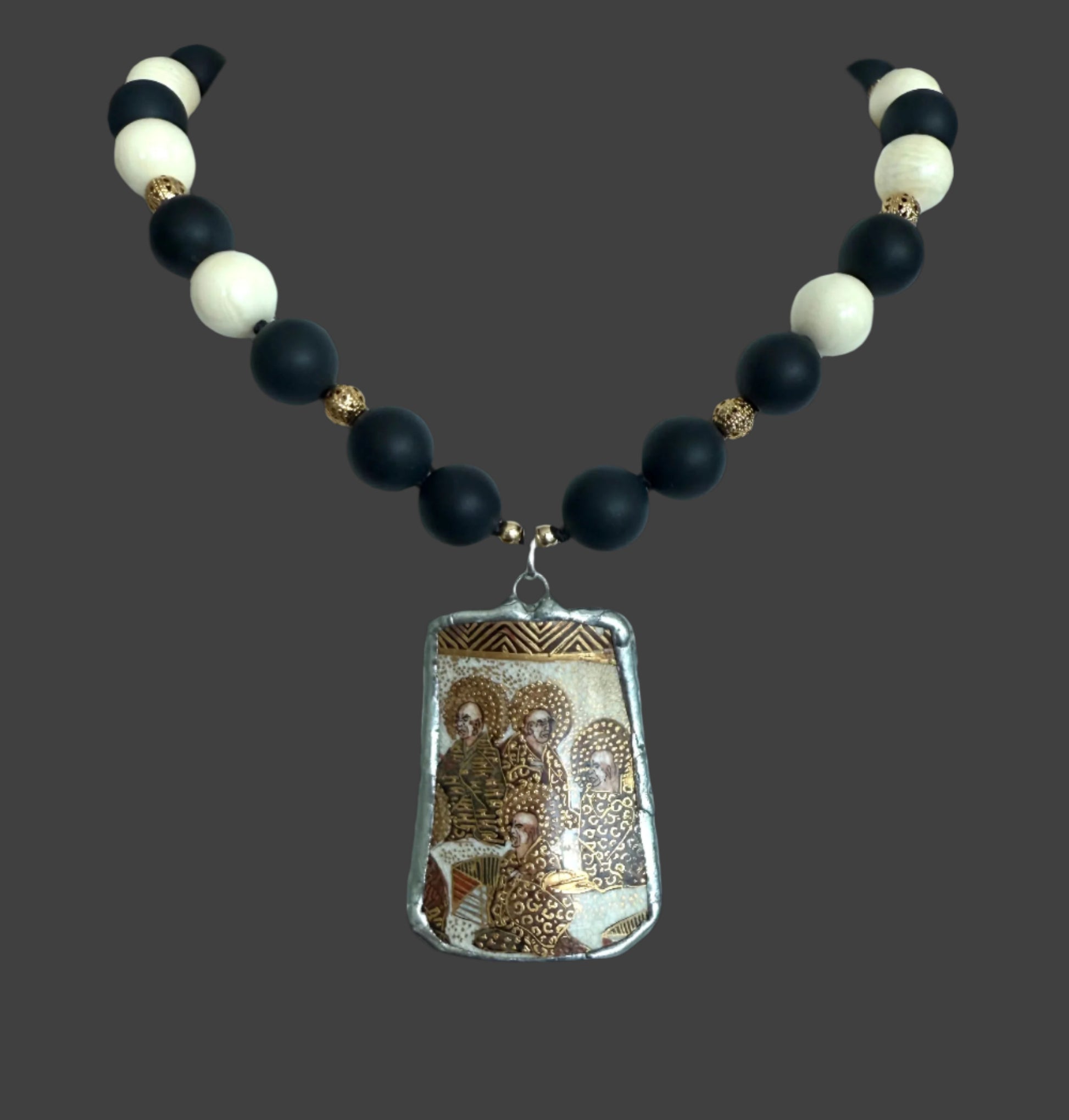 This exquisite 19" necklace features a harmonious blend of 12mm matte onyx beads and 12mm reconstituted amber beads, carefully crafted to resemble ivory, complemented by delicate 6mm gold-plated filigree beads. At its heart lies a rare 2" antique Japanese Satsuma pendant, set in sterling silver, depicting a distinguished group of luminaries engaged in a board meeting. The pendant’s intricate detailing and historical significance make it a captivating centerpiece. This necklace not only showcases exceptional craftsmanship but also offers a unique narrative, making it a singular treasure for collectors and enthusiasts alike. Only one piece is available, underscoring its exclusivity and refined elegance.