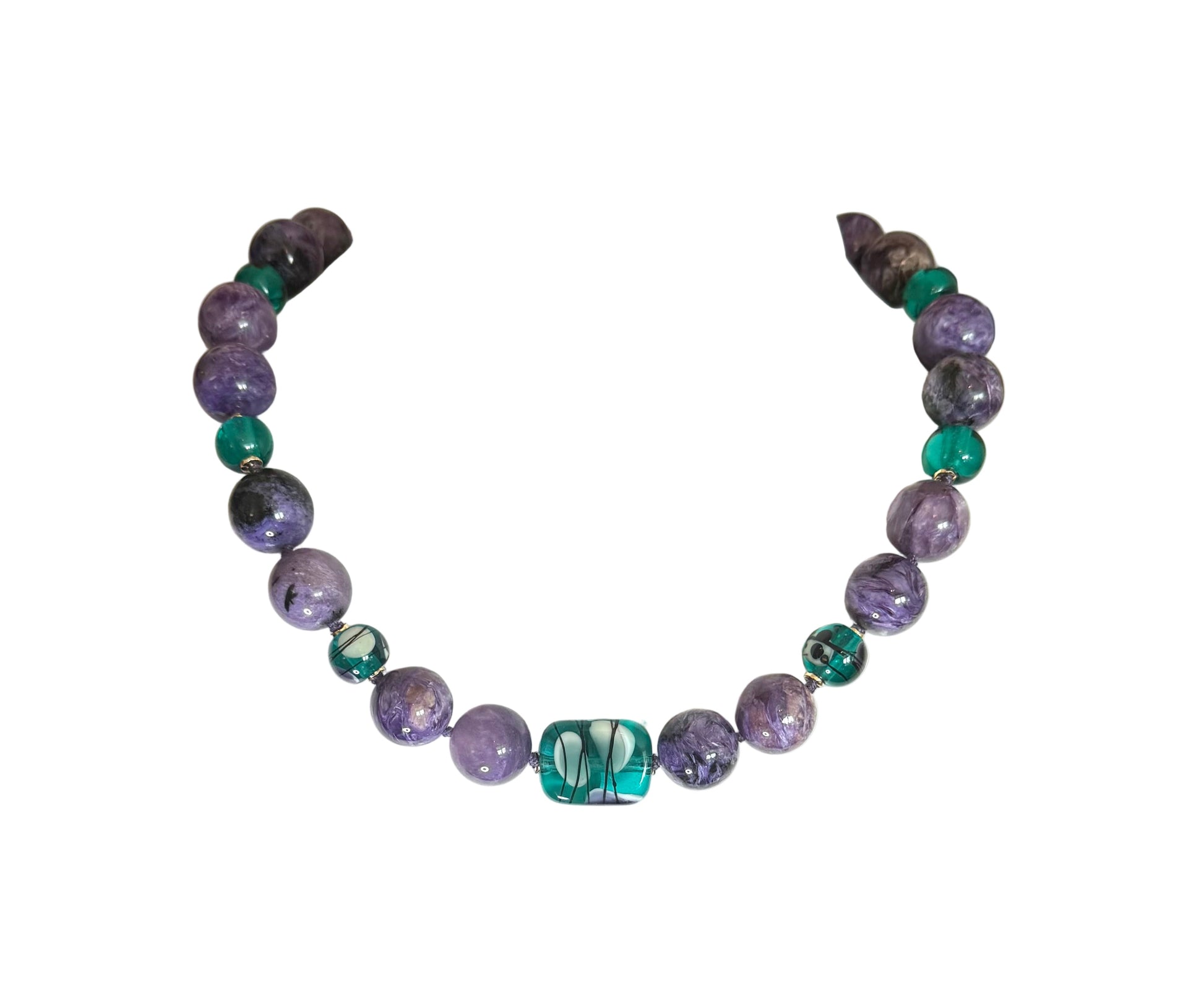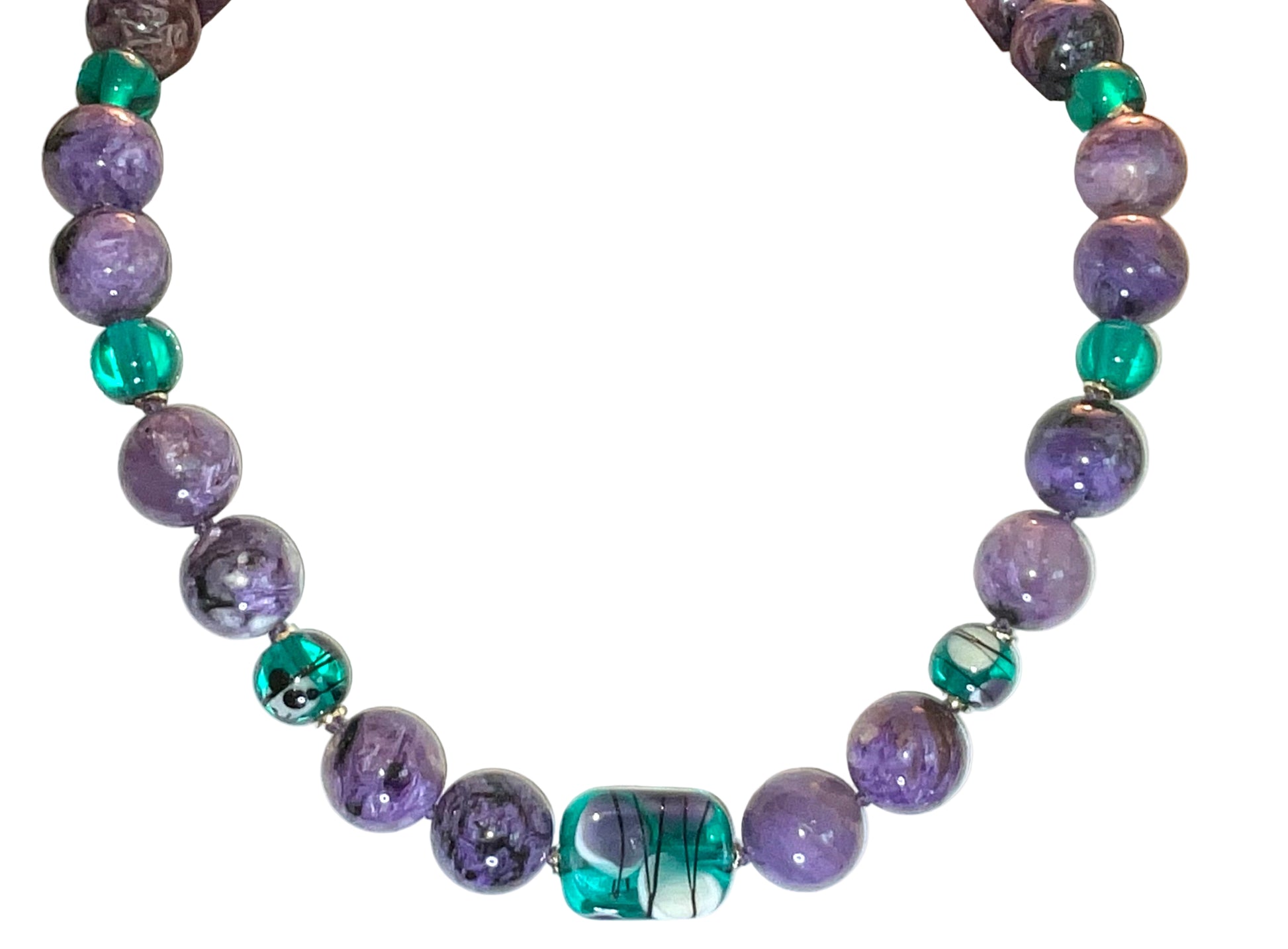 Charoite, a rare and captivating purple gemstone, features distinctive swirling patterns. Purple symbolizes power, insight, tranquility, magic, or luxury—qualities it embodies effortlessly. This unique 19" necklace combines Charoite with lampwork glass beads handcrafted by an American artisan. Each bead is individually knotted with purple thread, enhancing both visual appeal and strength. Small gold-plated discs flank the lampwork glass, offering protection while accentuating their beauty. This necklace is an exceptional and finely crafted accessory for those who appreciate artistry and elegance.
