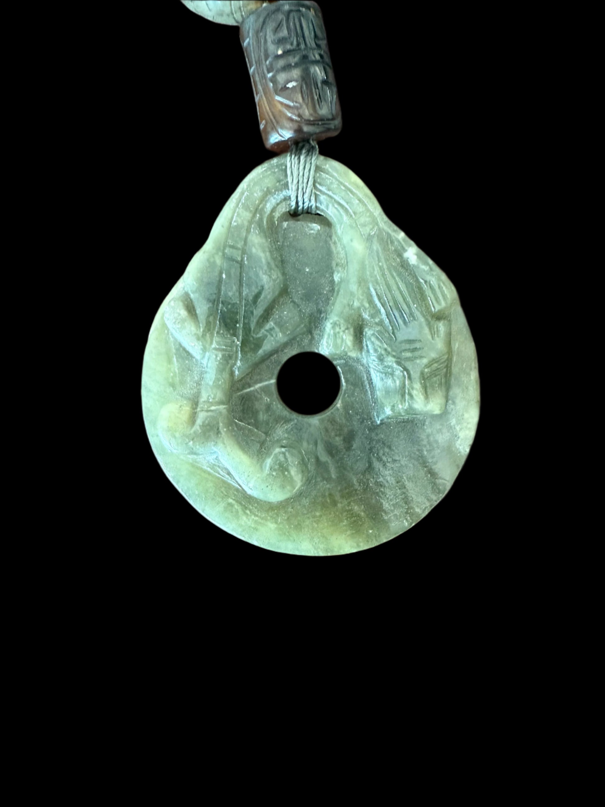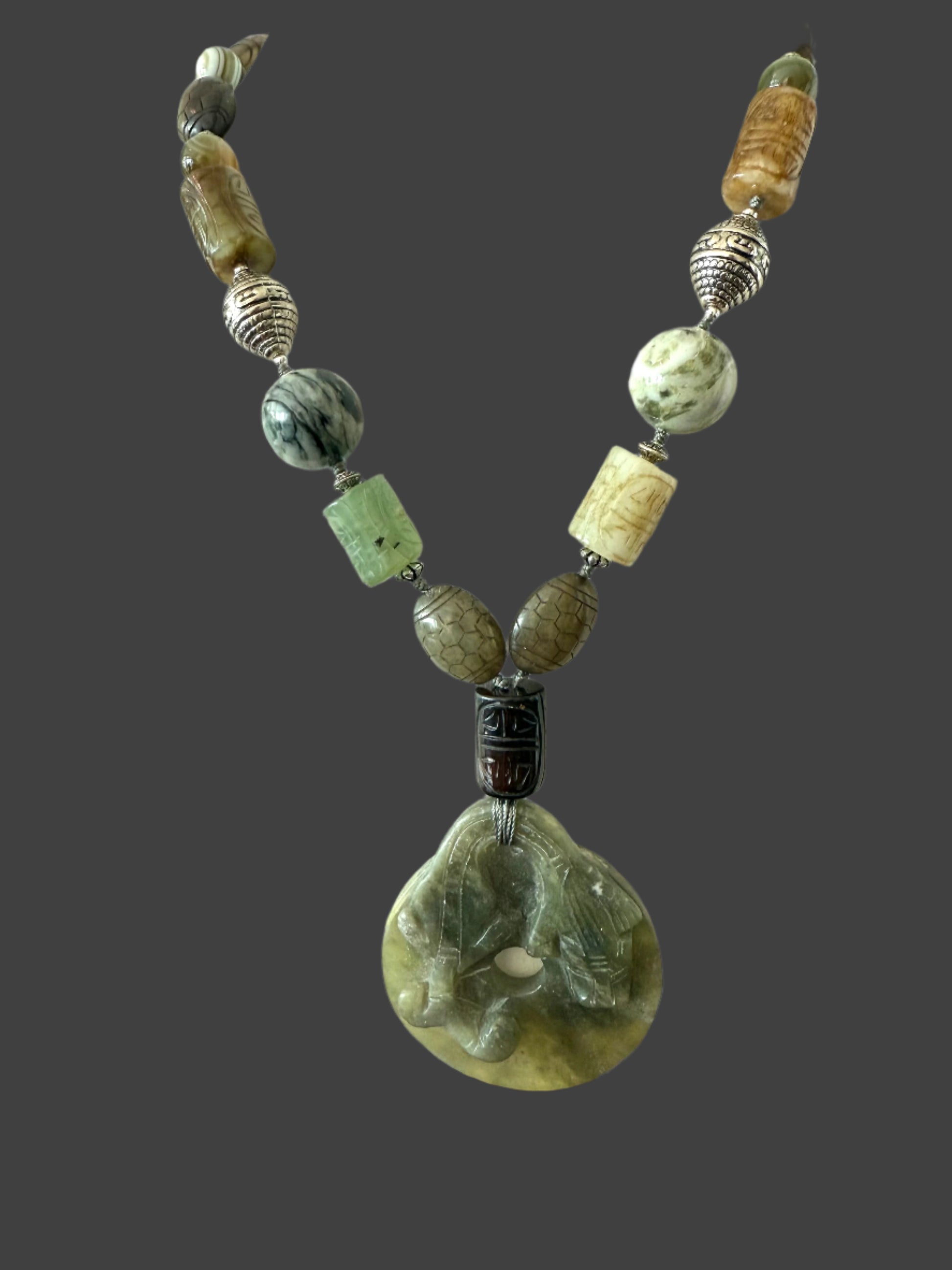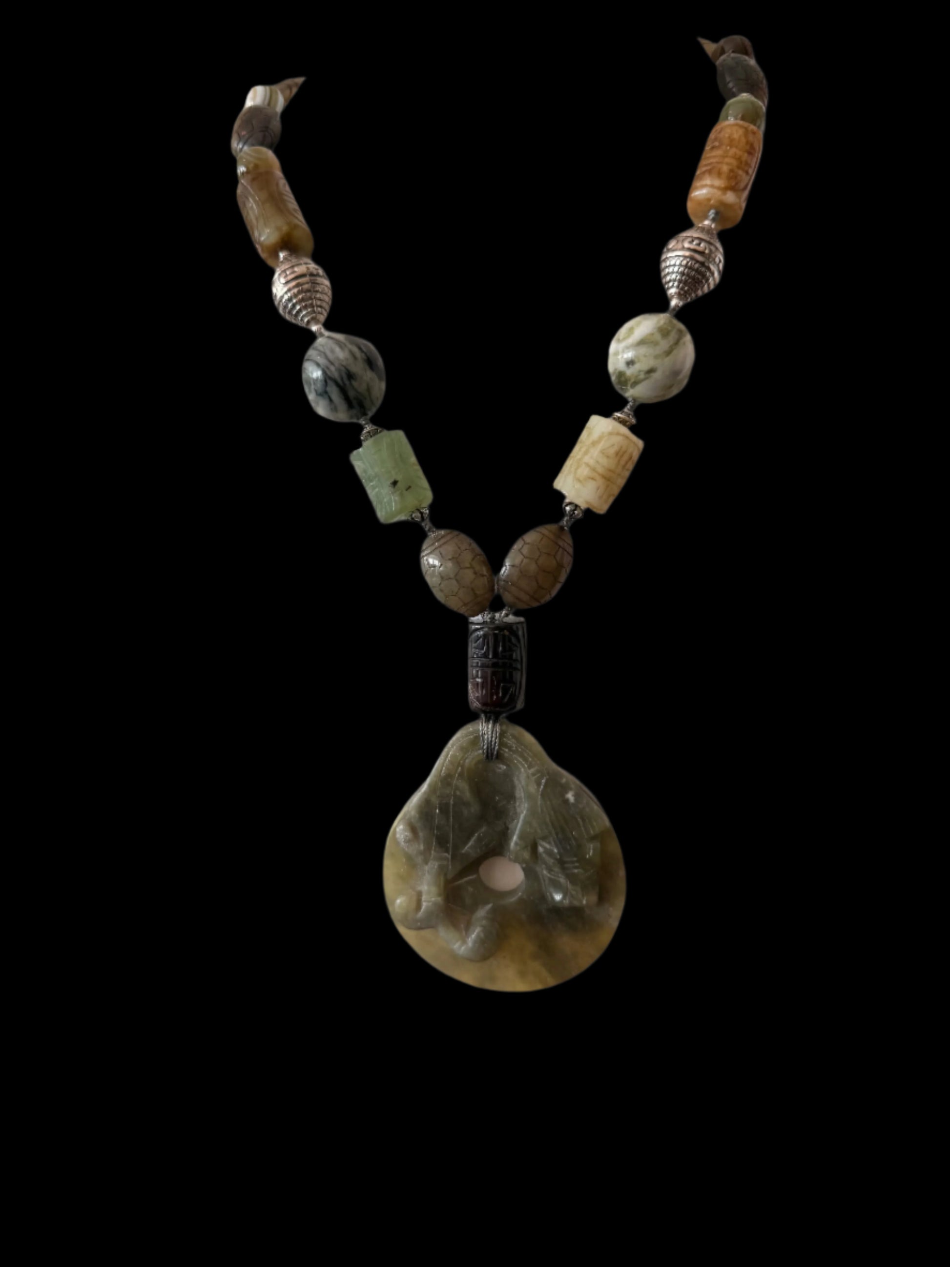 This 21" necklace features an exquisite Vintage Jade carved Dragon at Rest pendant measuring 2.75". The piece artfully combines Vintage African trading beads with silver accents, agate, and multicolored carved jade barrels. Each element is meticulously double-knotted with dark gray thread, creating a sophisticated and secure construction throughout the entire design.