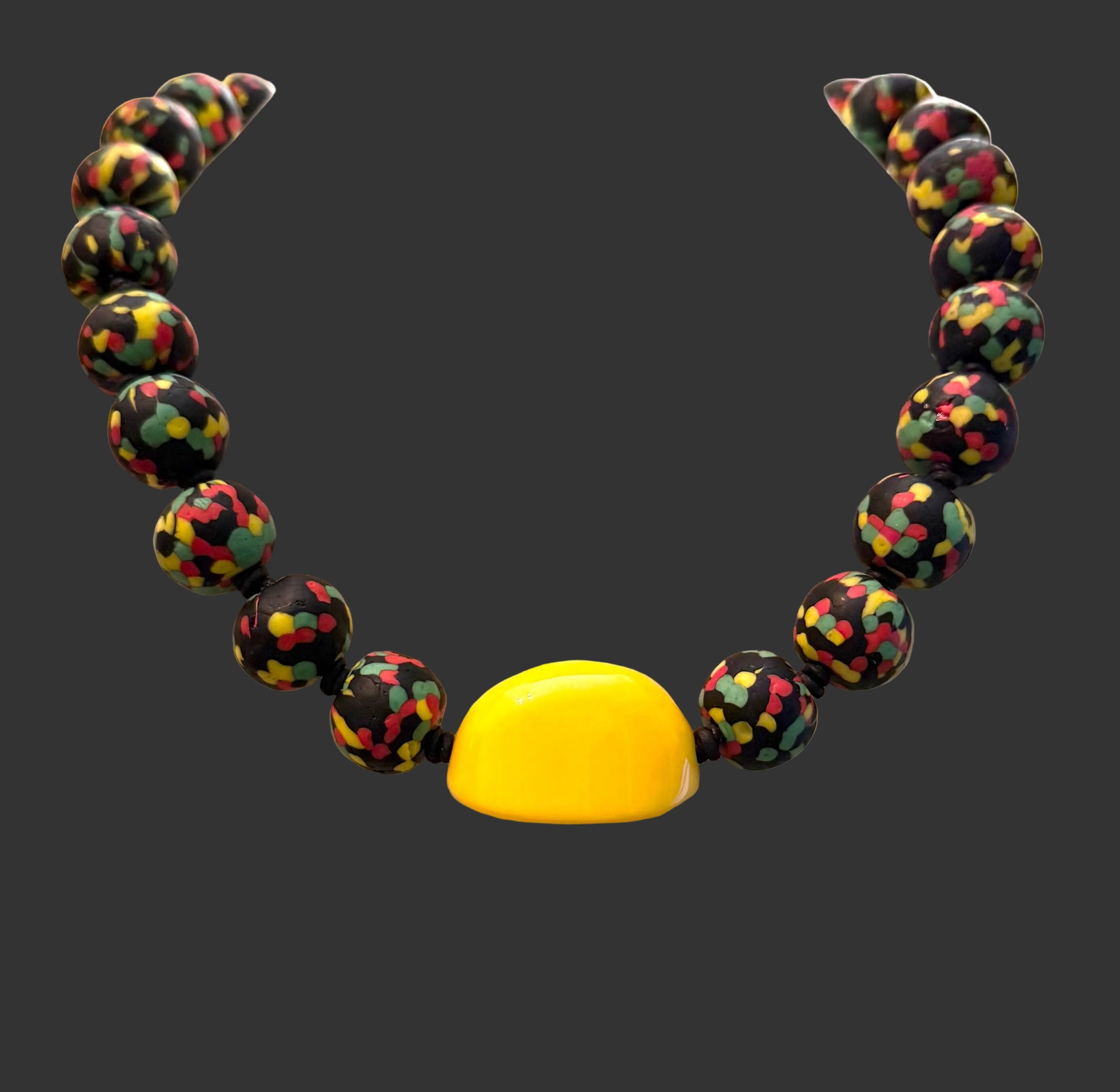 Make a statement with this 20-inch necklace that bursts with personality and color. Handcrafted with vibrant 17mm fused glass beads in a spectrum of hues, it features a striking yellow lucite focal bead that commands attention. Whether you're layering it casually over linen or creating dramatic contrast with darker pieces, this playful accessory transforms any outfit into something uniquely you. Perfect for adding a pop of joy and creative flair to your everyday style.