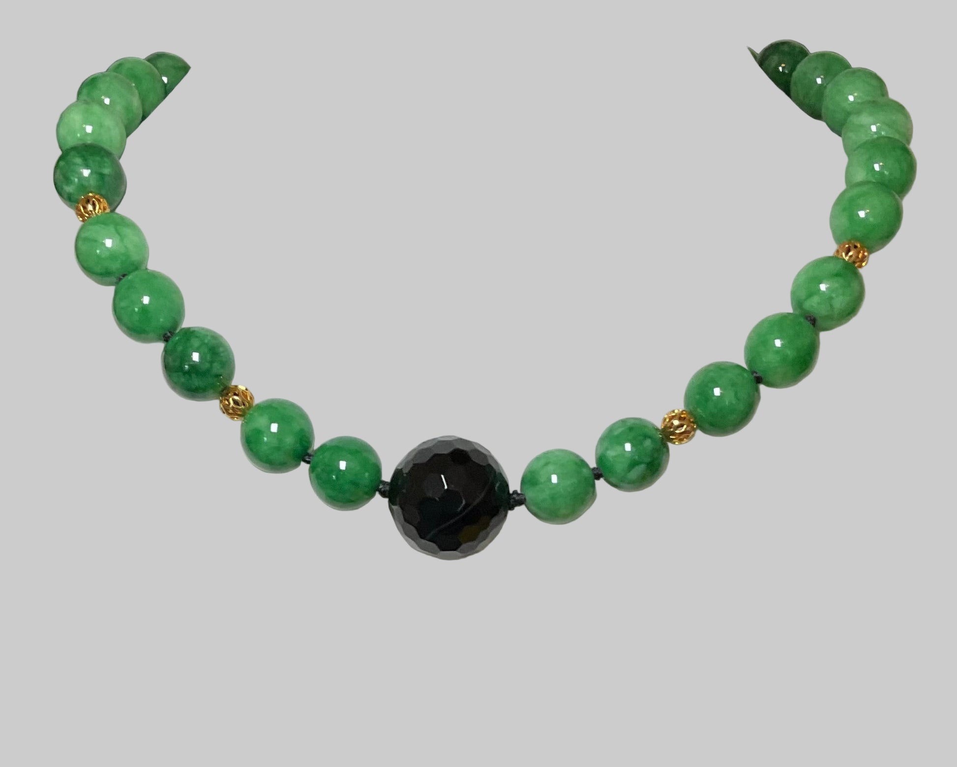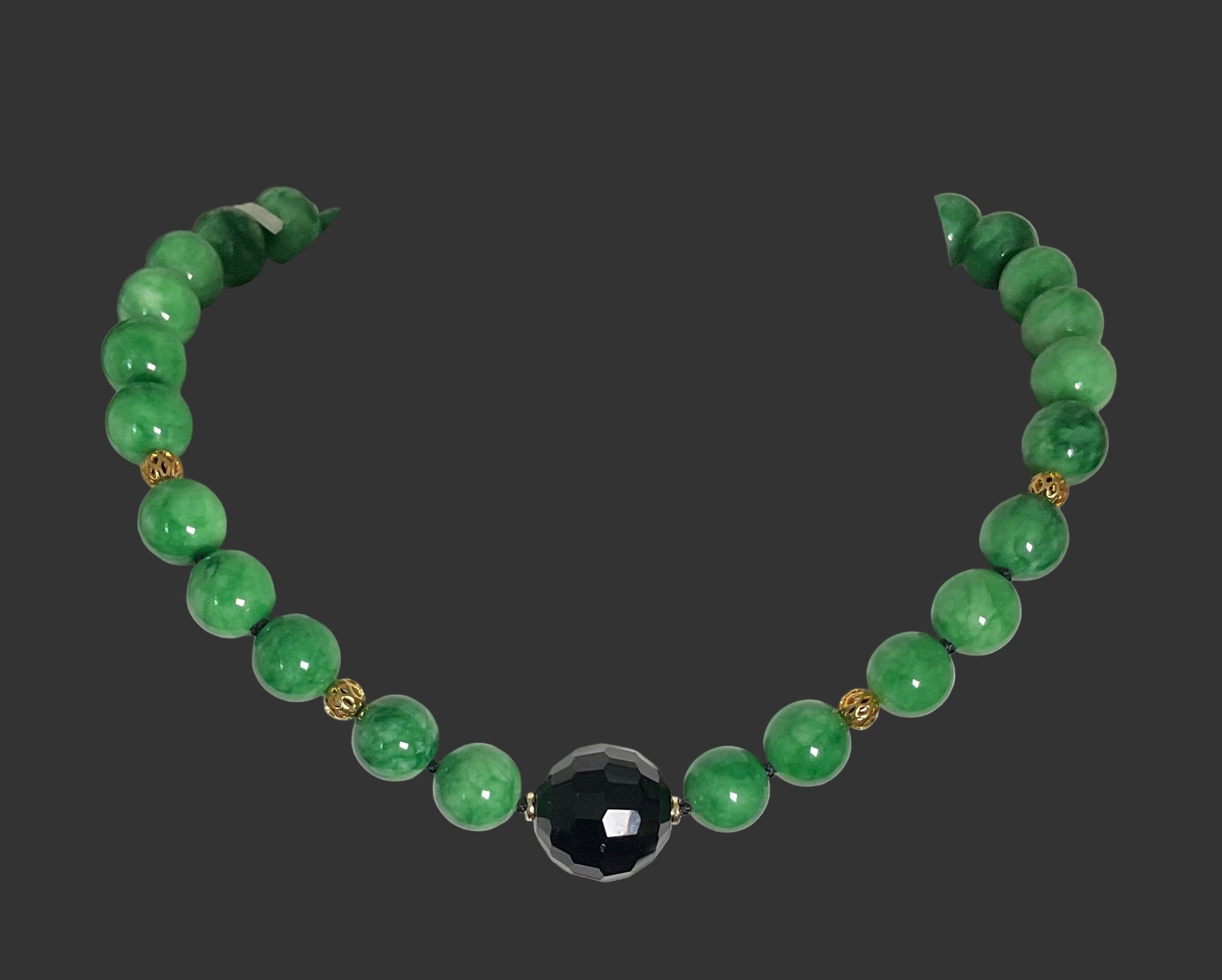 This stunning necklace is a true testament to the artistry and craftsmanship that embodies Asian culture, featuring a captivating blend of 12.5mm Jade and a 20mm faceted Onyx bead as its centerpiece. Complemented by four exquisite 6mm gold-plated ornate beads, this 18" necklace dances between elegance and intrigue. The thoughtful design—knotted between each bead with resilient black thread—ensures durability and enhances its aesthetic appeal, and let’s not forget the magnetic clasp. Whether you’re treating yourself or gifting it to someone special, this necklace is more than just an ornament; it’s a bridge between cultures.