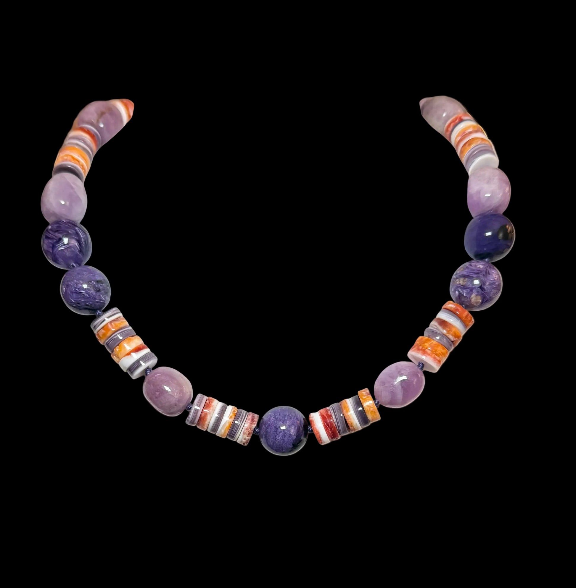 This 18" necklace, "Deset in Bloom" is a warm, harmonious combination of 15mm Charoite beads, 17mm Kunzite chunks and groups of 8mm Wampum Shell & Red Spiny Oyster Shell discs. These shell discs bring together two legendary shell materials. The deep violet banding of the Wampum shell meets the fiery coral-red tones of the Spiny Oyster and create a bold rhythnm of color.I used a purple thread to knot between beads which adds interest and durability. It has a lobster claw clasp.