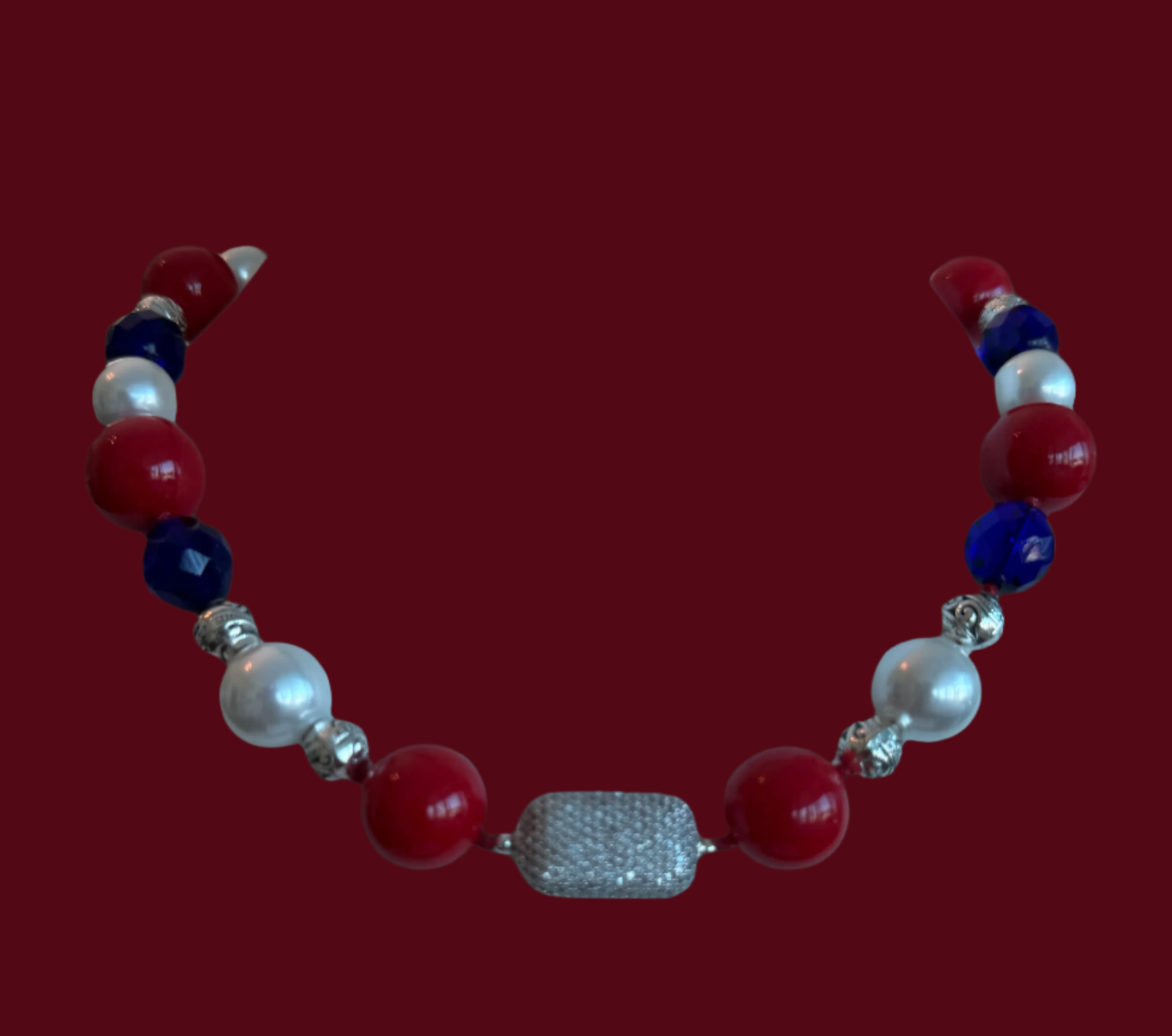 Let us take a moment on Memorial Day to honor those who gave their lives in service to our nation. It began as Decoration Day, established by The Grand Army of the Republic to adorn the graves of fallen soldiers with flowers. This 18" necklace features faux pearls, red porcelain beads, crystals, silver beads, and a magnetic clasp in patriotic colors of red, white, and blue. It's the perfect addition to your holiday ensemble and a subtle yet elegant way to show your patriotism without wearing a flag. Let this necklace speak for itself as a symbol of remembrance.