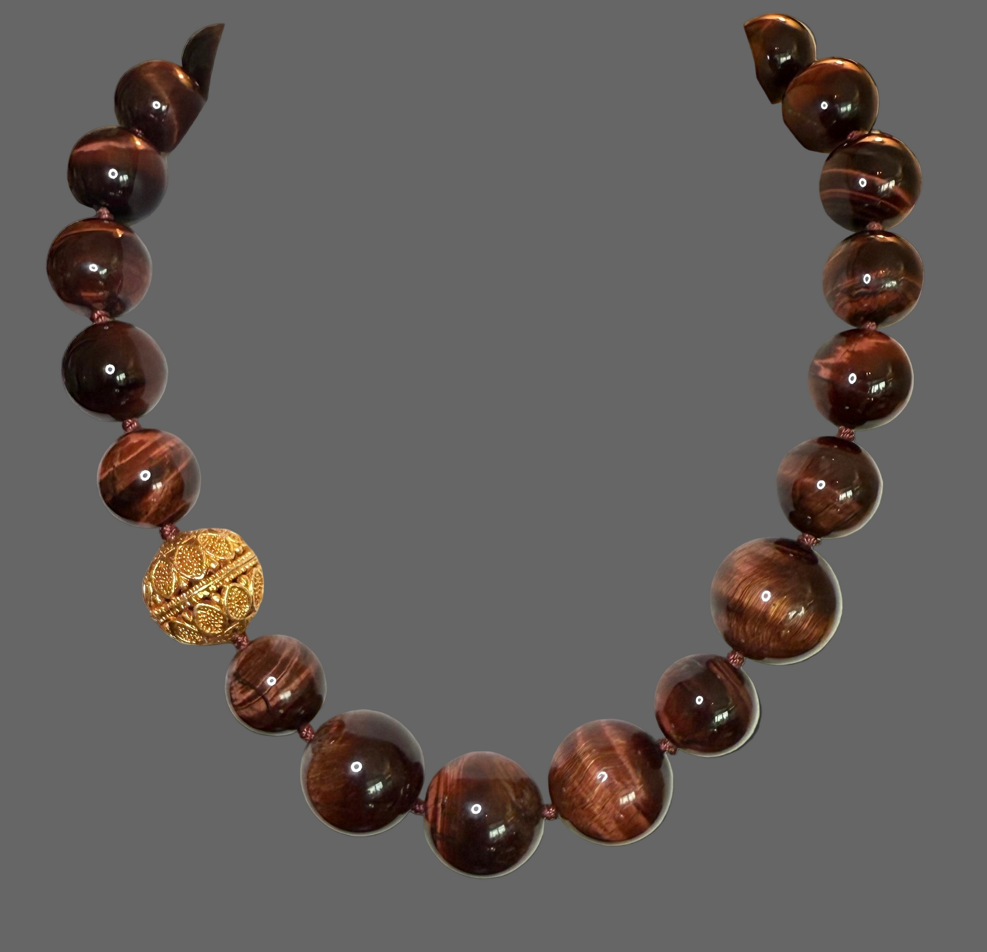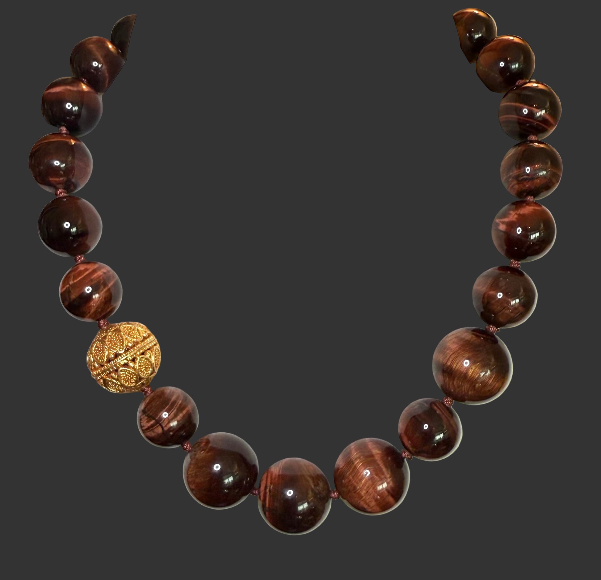 This 18" Mahogany Tiger Eye necklace features a striking combination of 20mm and 16mm mahogany Tiger Eye beads, accented by an exquisite gold-plated bead from Thailand positioned to create visual interest. Expertly strung on mahogany thread with double knots between each bead, the design highlights the rich hues and enhances durability. This unique piece stands out as an exceptional statement accessory.