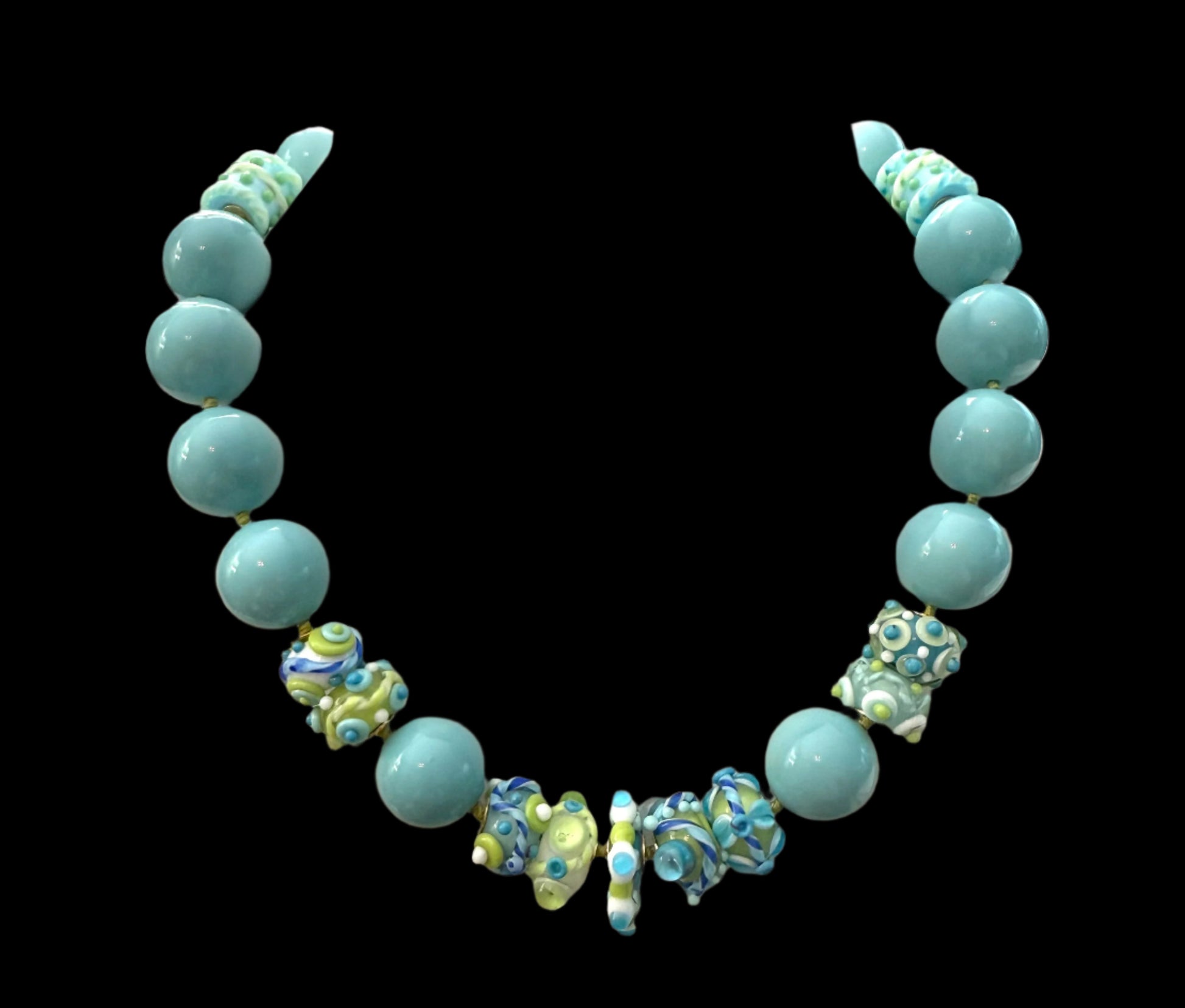 This exquisite 18" necklace features a lobster claw clasp and a blend of handcrafted, intricate lampwork glass beads from a skilled American artisan, paired with 16mm blue acrylic beads. Tiny gold metal discs are thoughtfully placed between the glass beads for added protection. The necklace is elegantly strung on Spring green thread, with knots between the beads to ensure strength and durability.