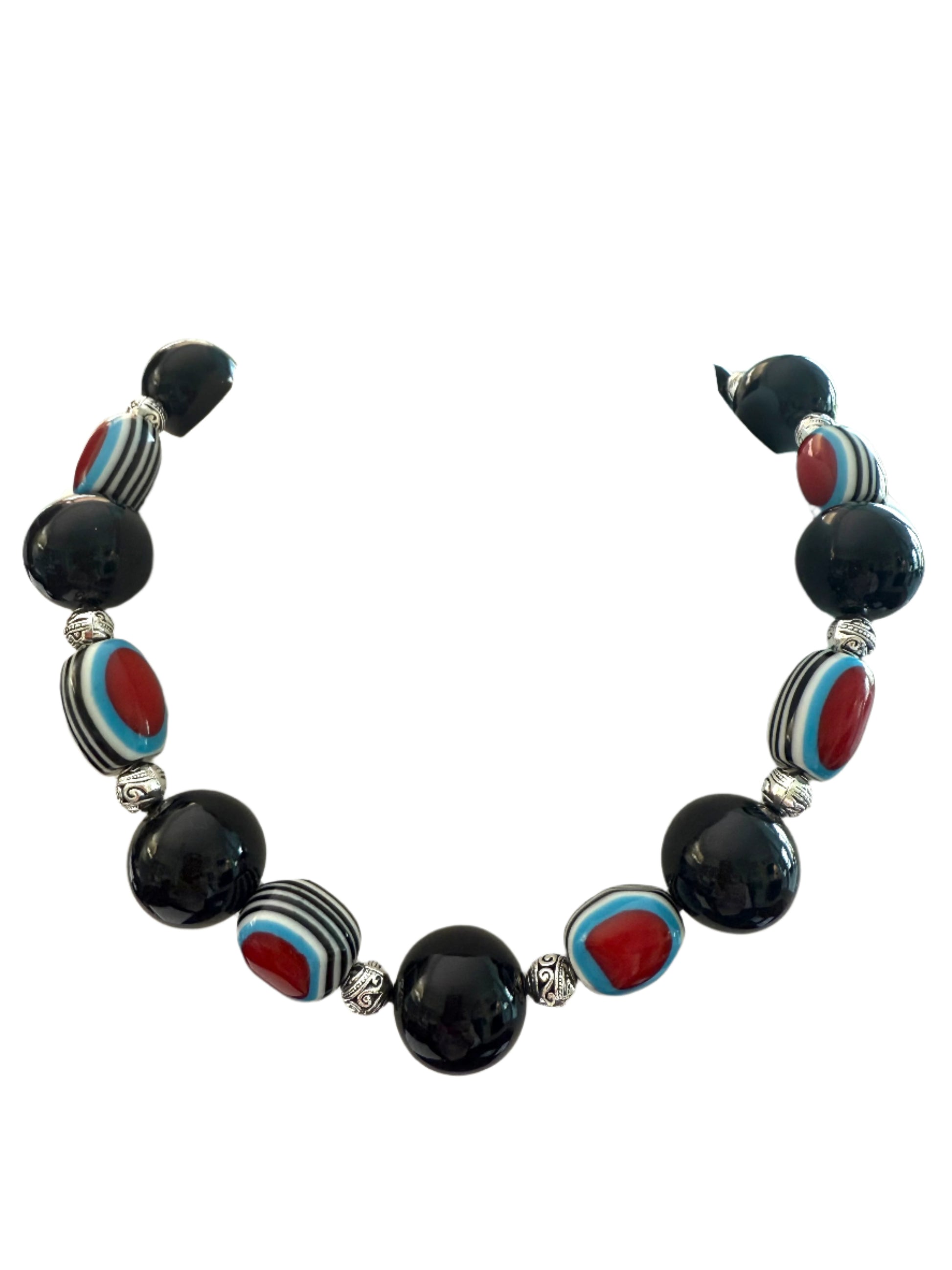 This 19" statement necklace features a mix of 22mm black beads, designed beads in shades of red, white, and blue, 8mm silver accent beads, and 14mm black beads at the back for effortless wear. Pair it with a black sundress for a chic summer look.