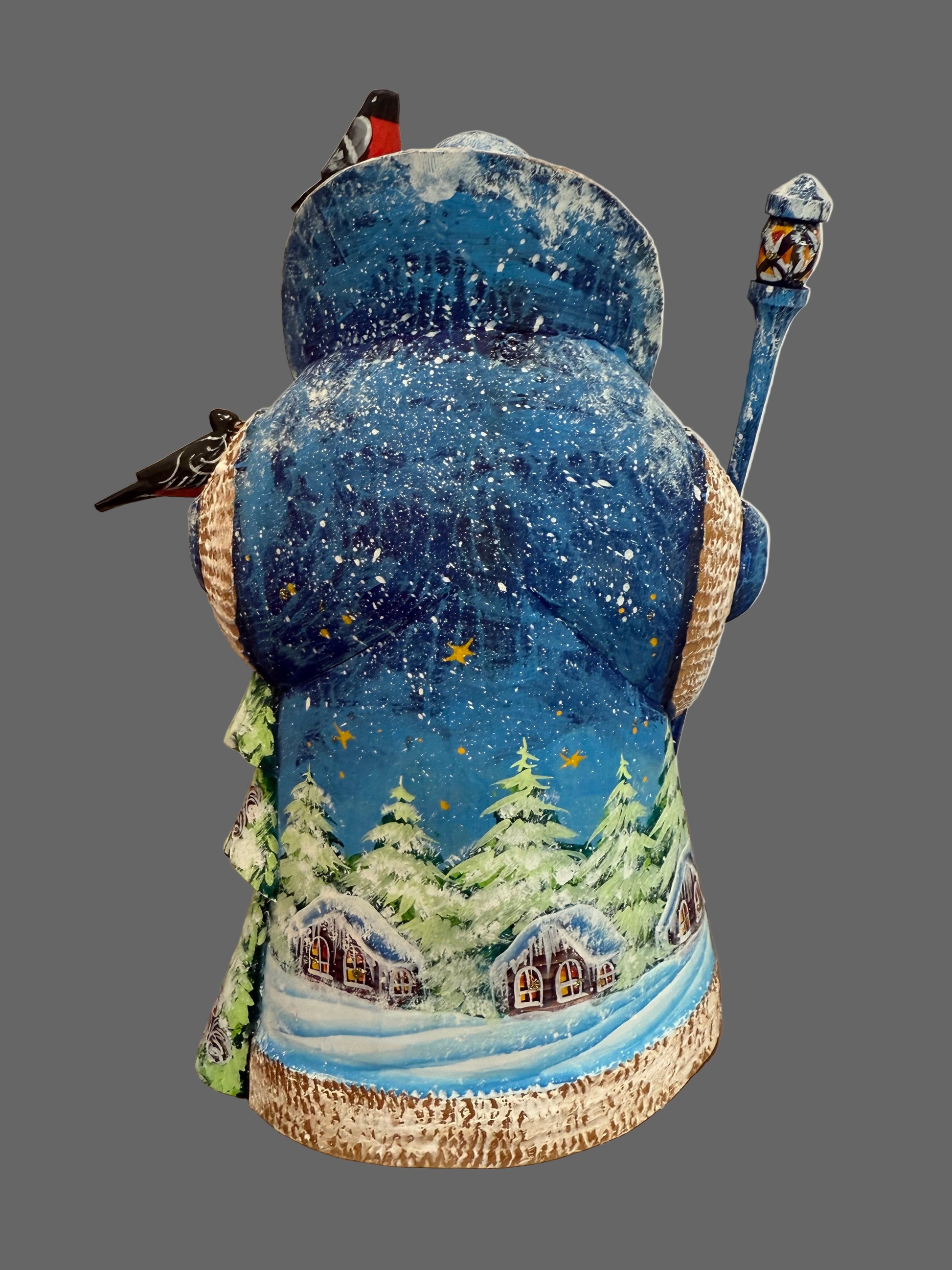 This meticulously hand-carved and hand-painted Santa figurine captures a charming winter scene with exceptional detail. Santa holds a Christmas tree, adorned by a delicate bird perched both on his hand and the hood of his coat, highlighting the artisan’s skill. In his other hand, he firmly grips a staff, symbolizing his journey through snowy landscapes. The reverse side portrays a serene night sky filled with twinkling stars and gentle snowfall above a quaint village framed by a dense forest. Standing 9 inches tall, this exquisite piece originates from a renowned artisan village in Hungary, showcasing traditional craftsmanship and festive artistry that make it a treasured holiday decoration.
