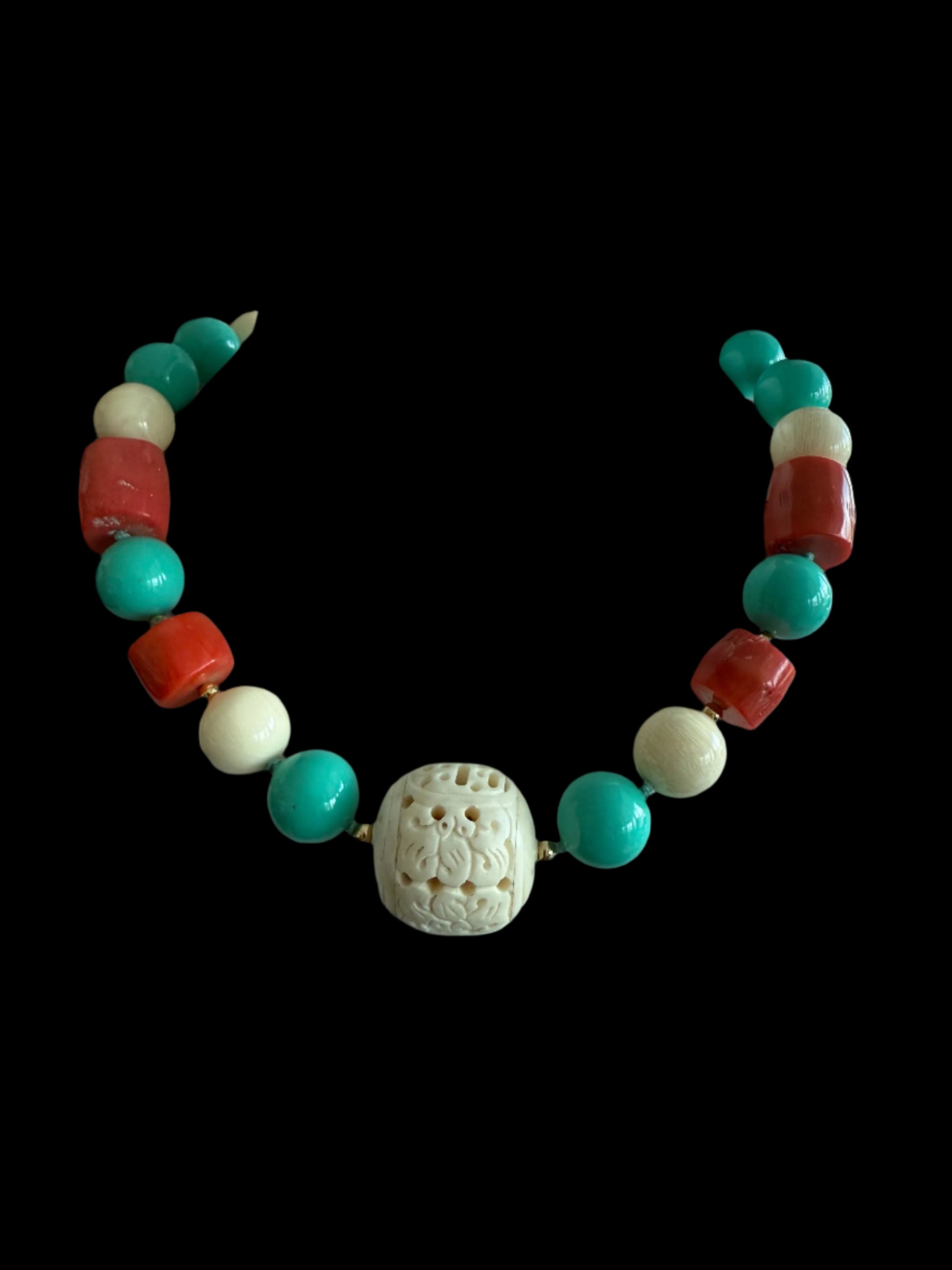 Experience the essence of summer with this exquisite necklace featuring vibrant coral and turquoise hues—perfect for warm weather ensembles. The composition includes 15mm lucite turquoise, 16mm reconstructed amber, and distinctive natural coral beads, all accentuated by a 30mm carved bone centerpiece. Meticulously knotted with turquoise thread between each bead, this 18-inch necklace is finished with a convenient magnetic clasp.