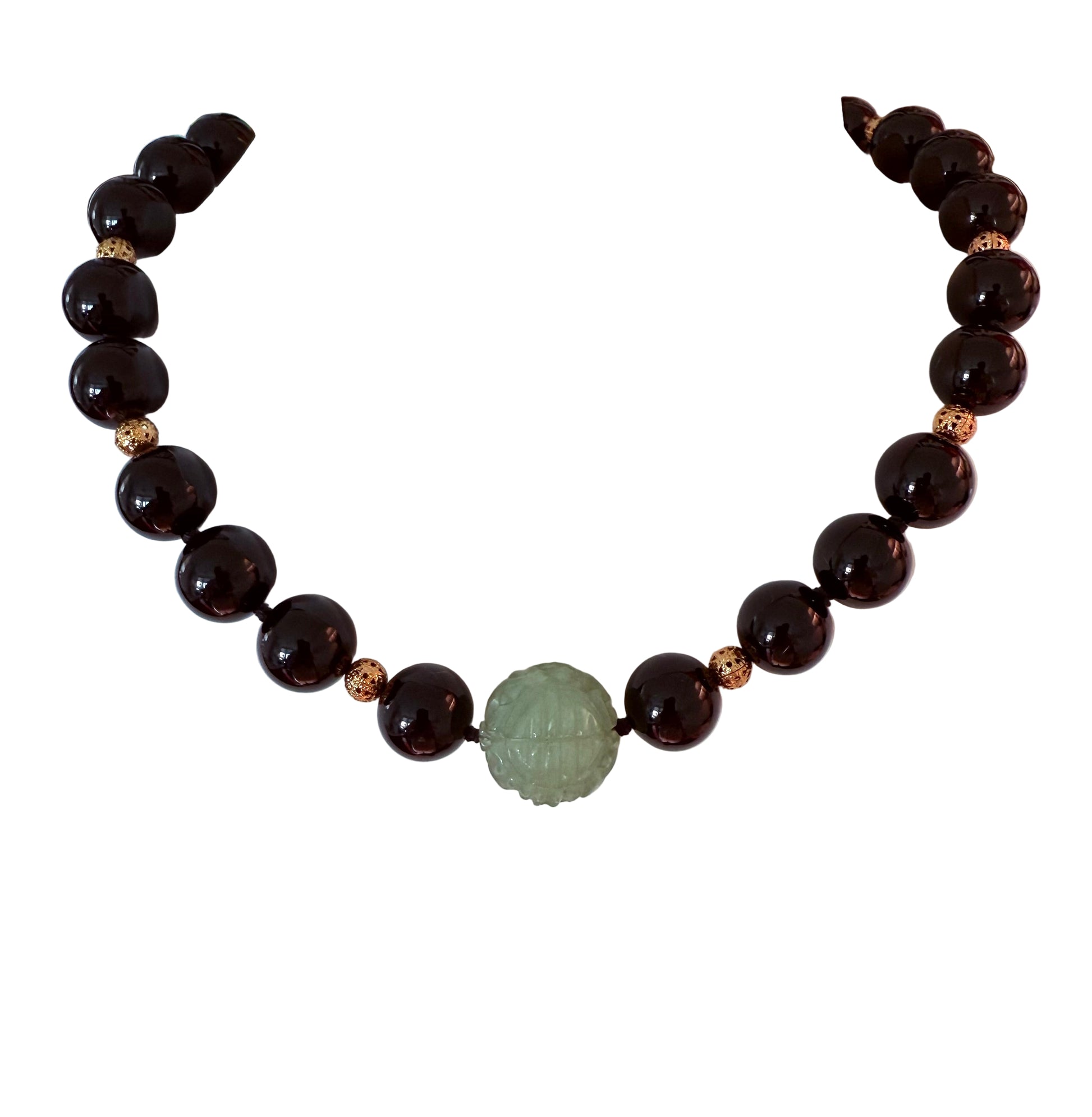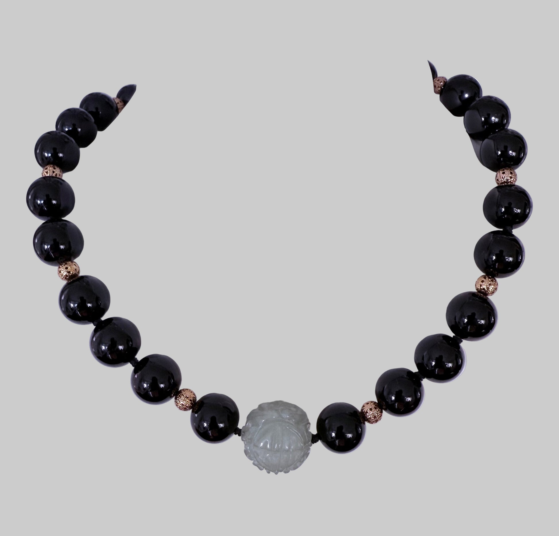 Crafted with discerning taste, this 18-inch necklace pairs polished 12mm onyx beads with an exquisite carved vintage pale jade focal bead, creating a composition of refined simplicity. Delicate 5mm ornate gold-tone spacers punctuate the design, introducing warmth and dimensional detail without overwhelming the piece's inherent elegance. The interplay between jade's serene presence and onyx's bold sophistication yields a necklace of understated sophistication—one that commands attention through restraint rather than excess.